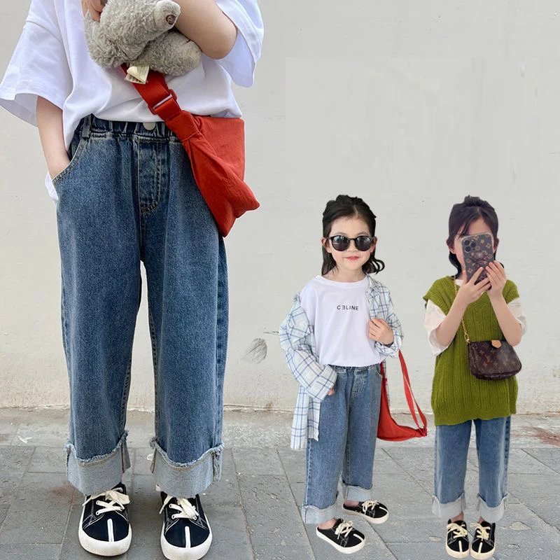 spring summer autumn kids crimped wide leg jeans girls loose thin denim pants children fashion casual trousers 2-10 years girl