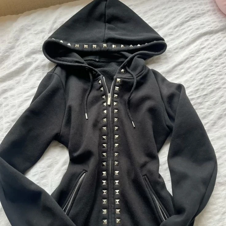 Y2K جديد ايمو موضة برشام قلنسوة بسحاب المرأة Harajuku الأسود المتضخم هوديي القوطية الرجعية الكلاسيكية البلوز الخريف الملابس