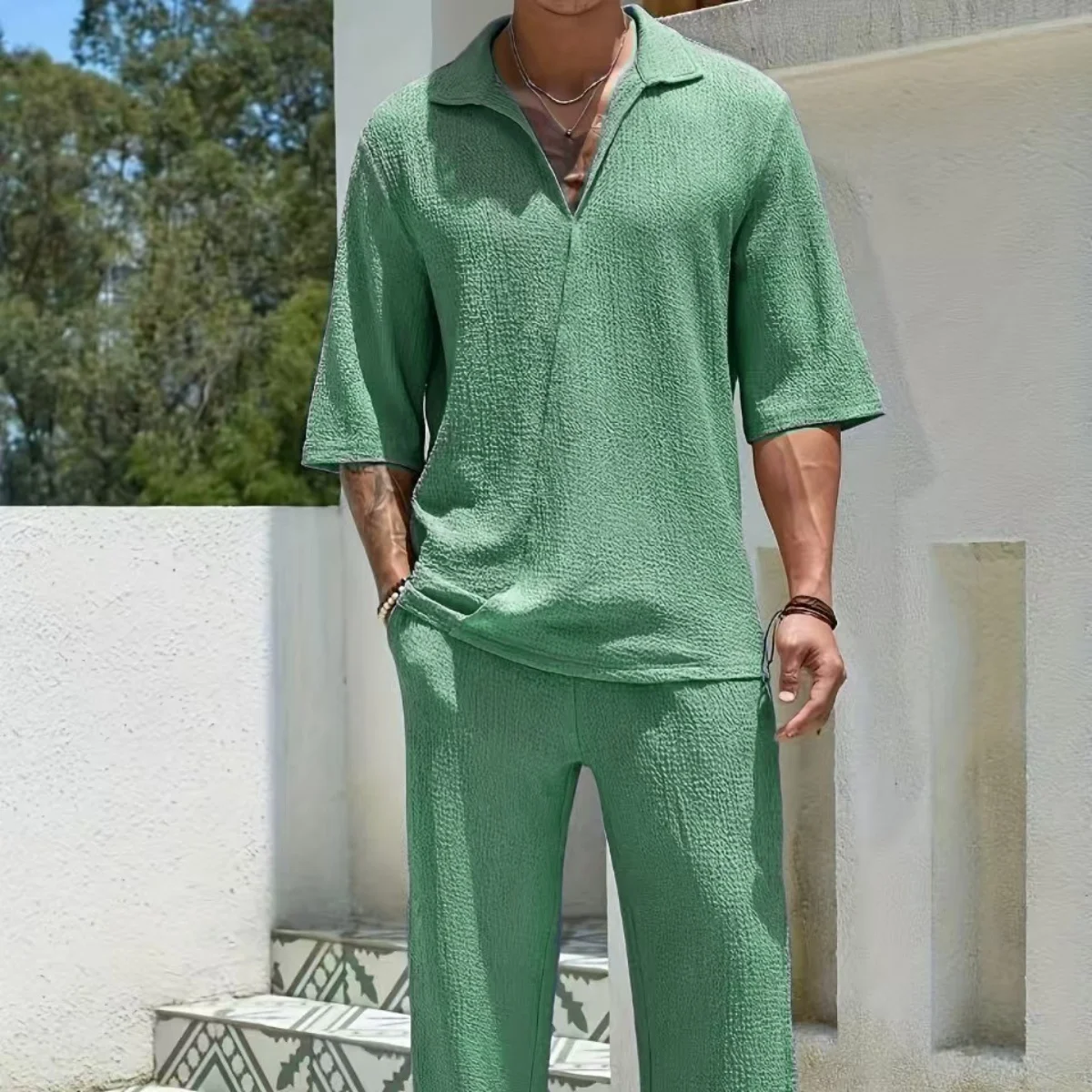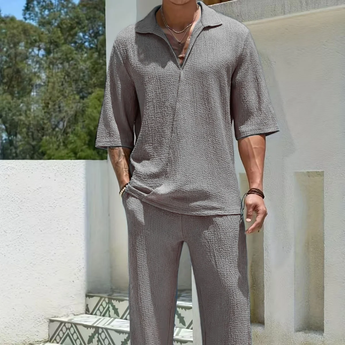 مجموعة الأزياء الرجالية هذه مثالية لأي مناسبة، بدءًا من النزهات غير الرسمية وحتى المناسبات الرسمية.إنه يتميز بمزيج أنيق من القطع العلوية والسفلية التي تكمل بعضها البعض بسلاسة.