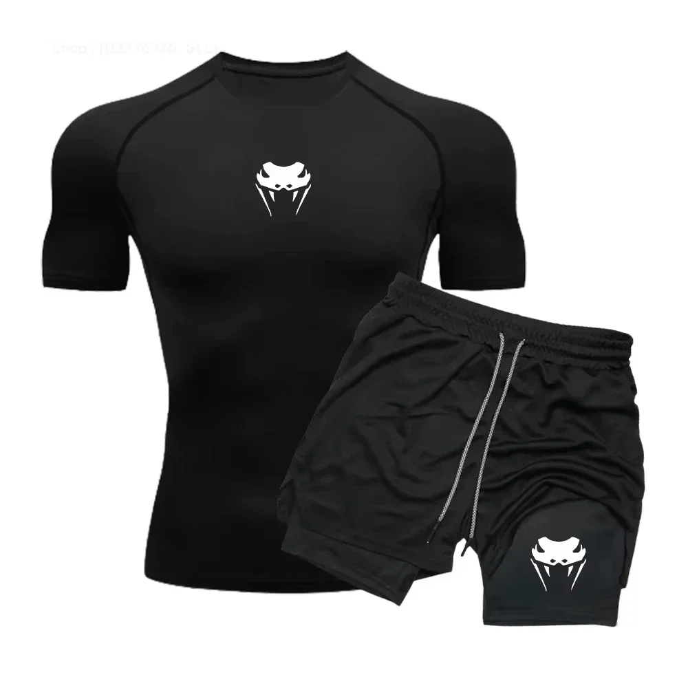 ملابس اللياقة البدنية الرياضية المضغوطة للرجال - مجموعة شورتات صيفية ضيقة سريعة الجفاف وأكمام قصيرة بطبقة مزدوجة RL0515