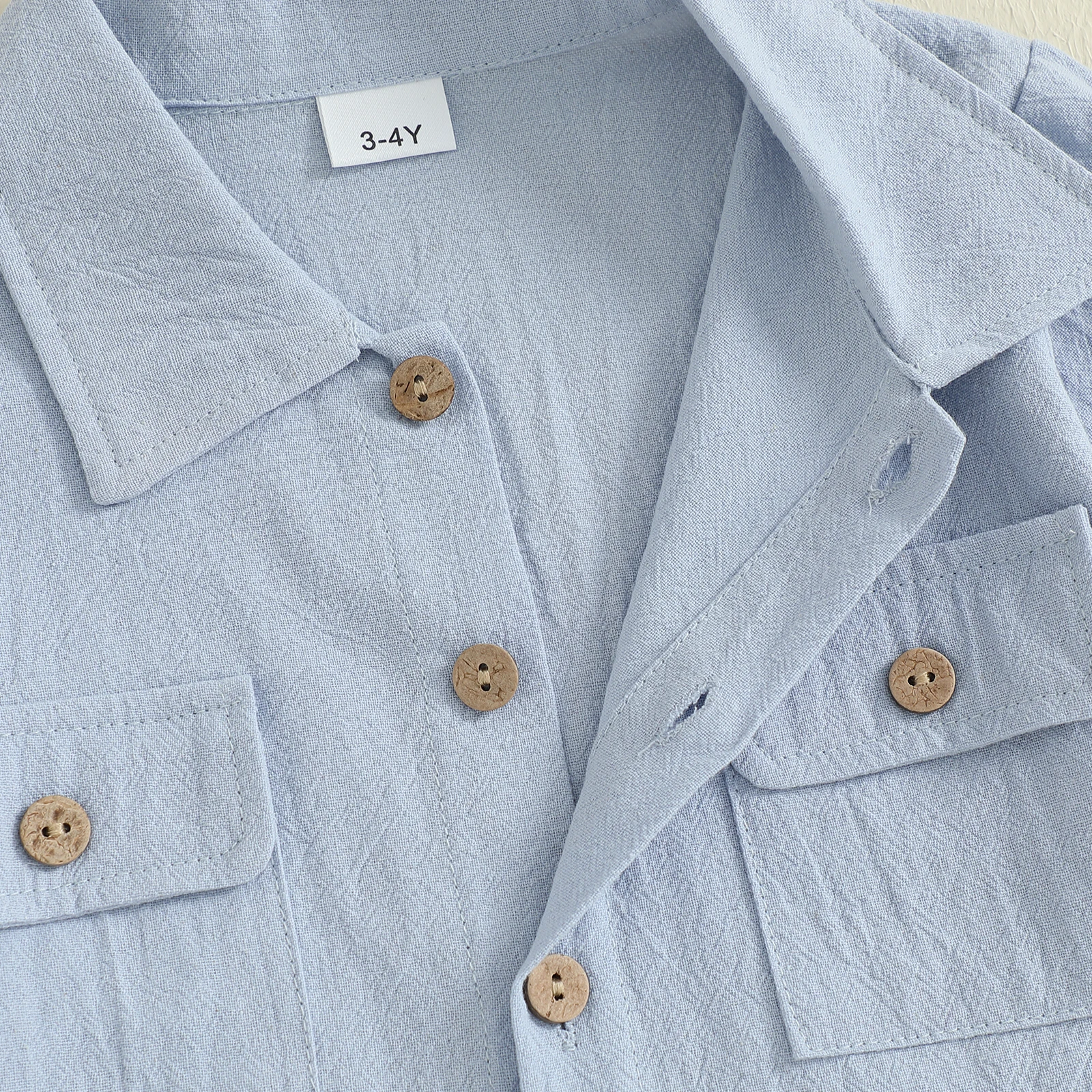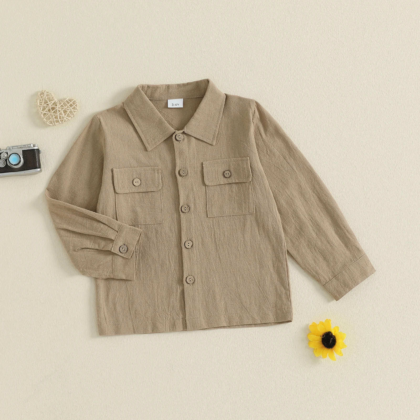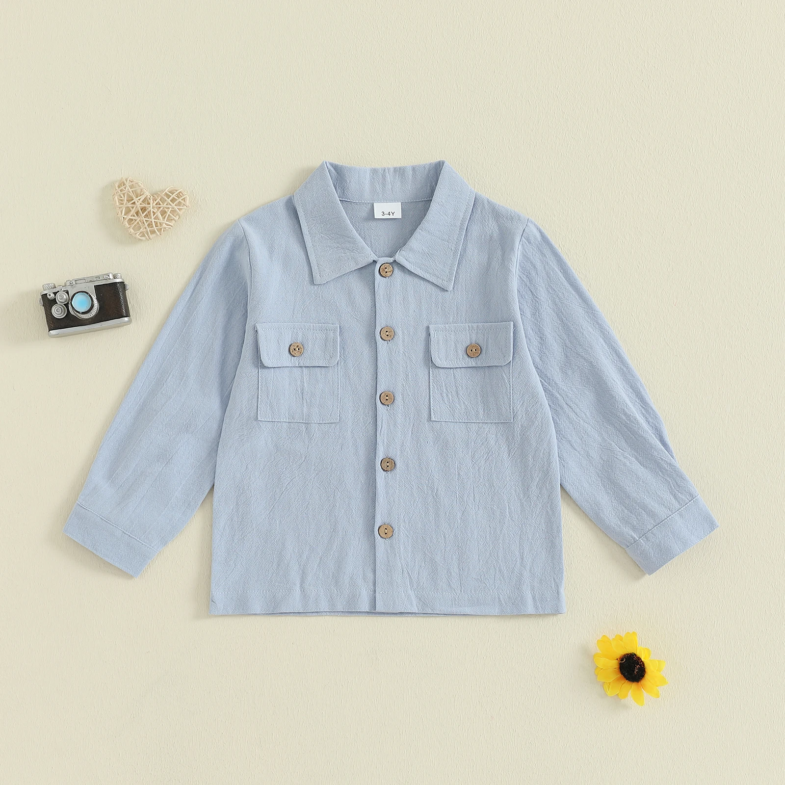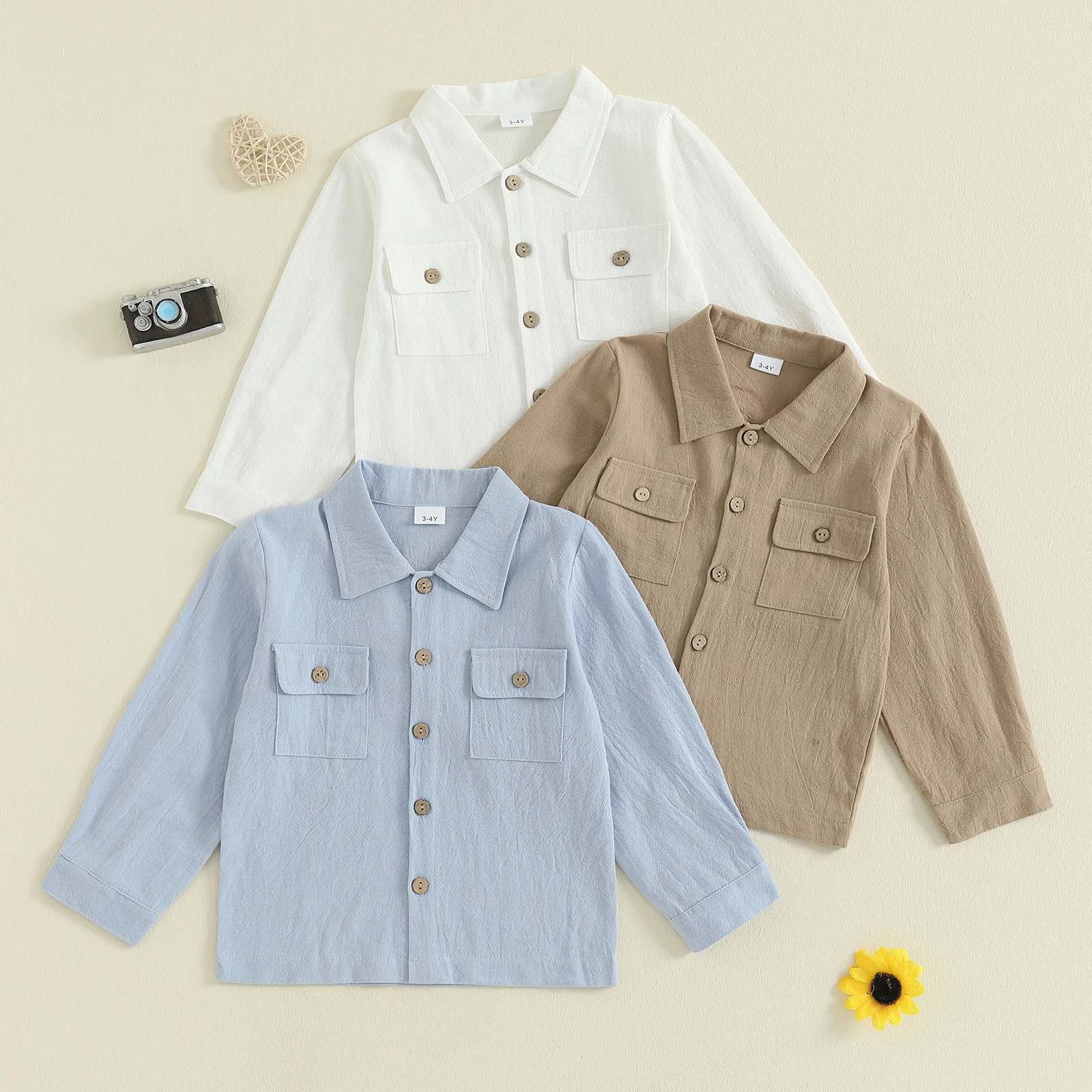 قمصان للأولاد الصغار من عمر 2 إلى 7 سنوات بلون سادة وأكمام طويلة وأزرار سفلية وطية صدر السترة للأطفال الصغار ملابس ربيع الخريف
