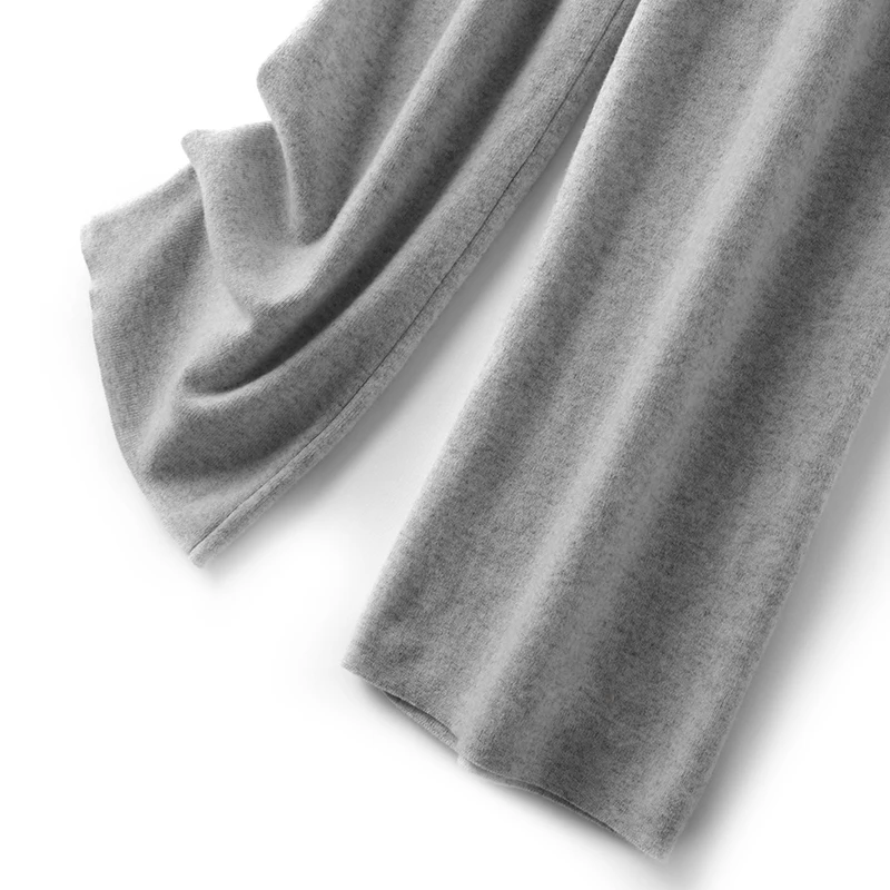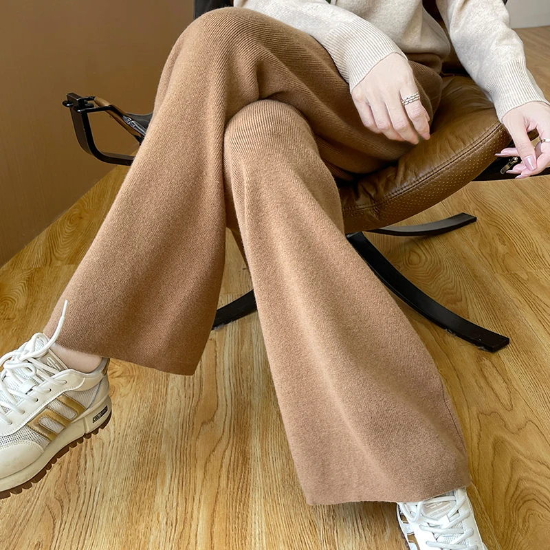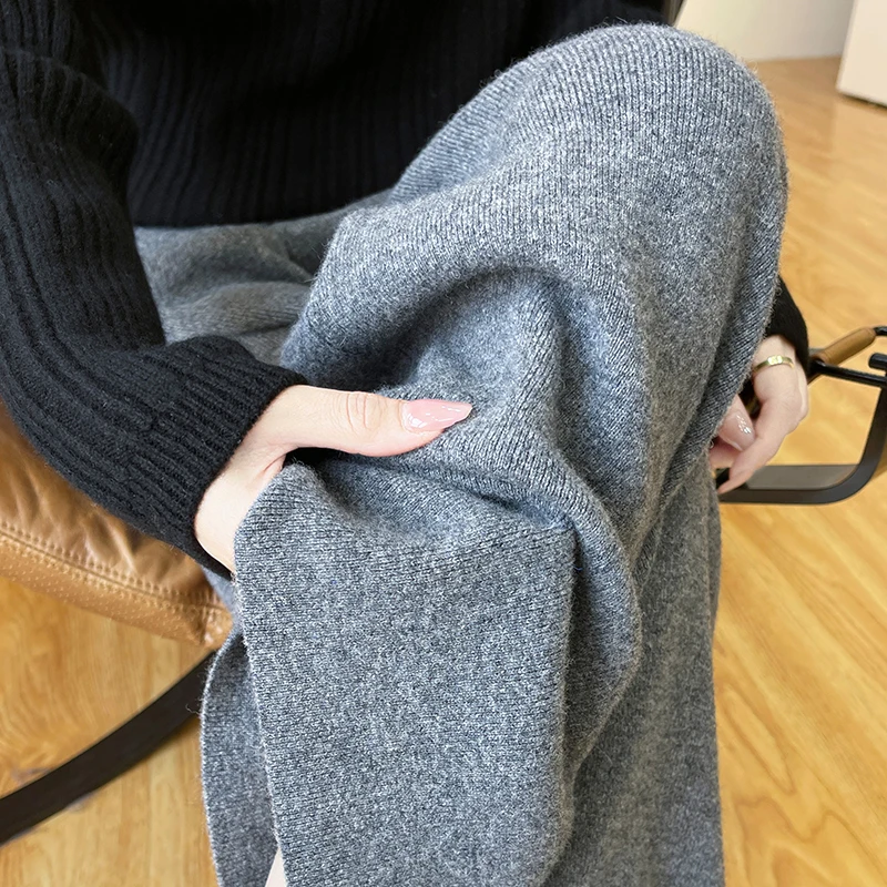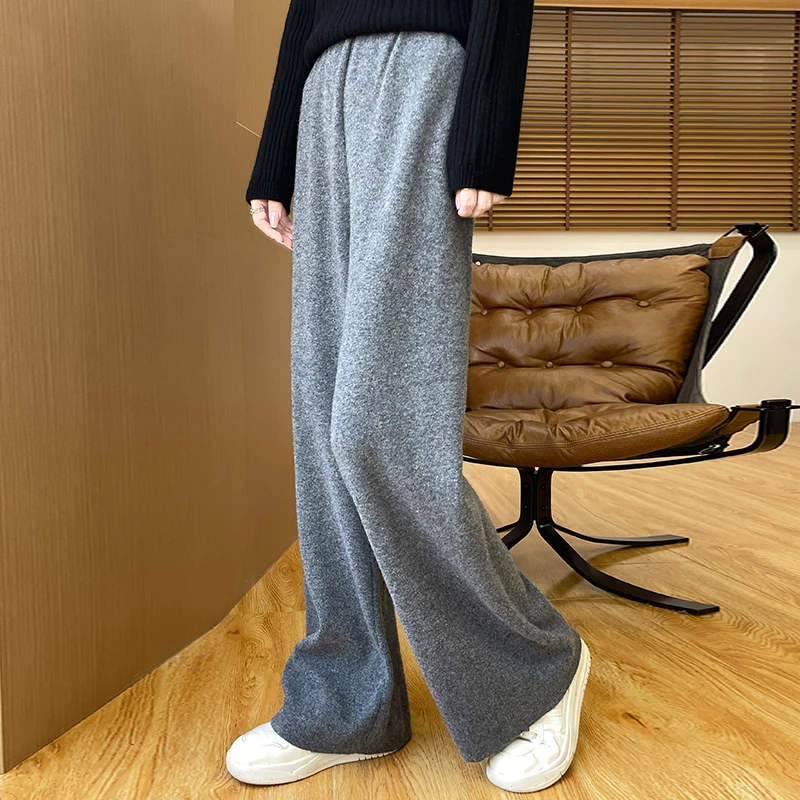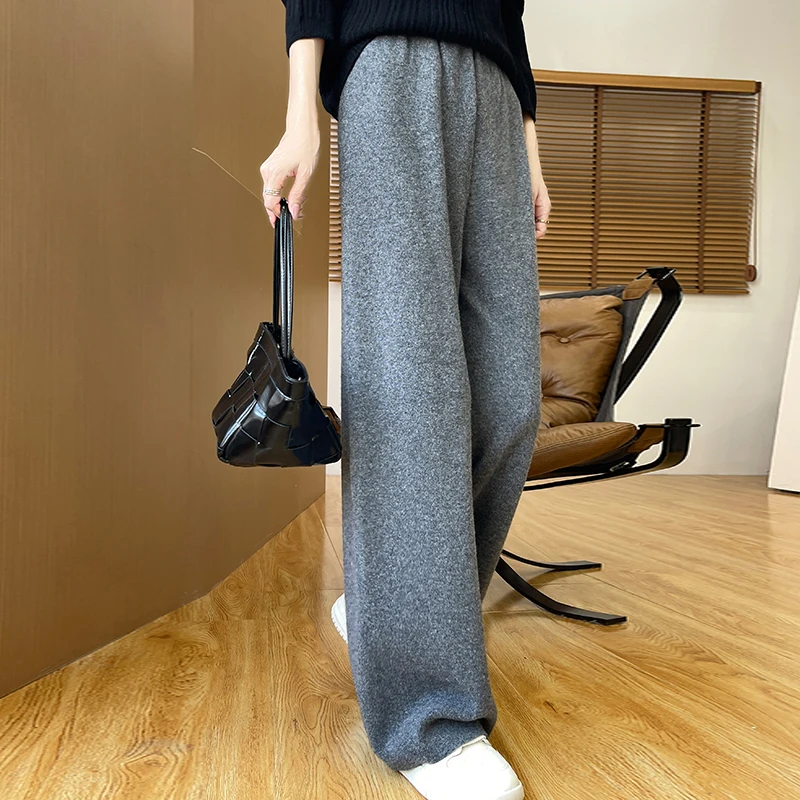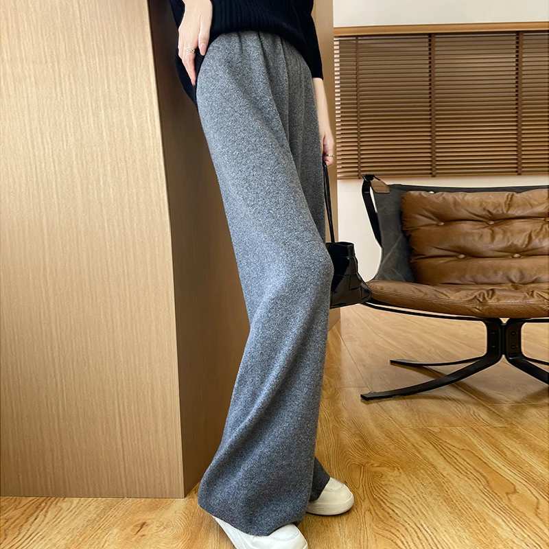 سراويل نسائية صوف مستقيمة للخريف والشتاء بخصر مطاطي 100% صوف ميرينو محبوك بجيوب صلبة سراويل كلاسيكية للمكتب للسيدات