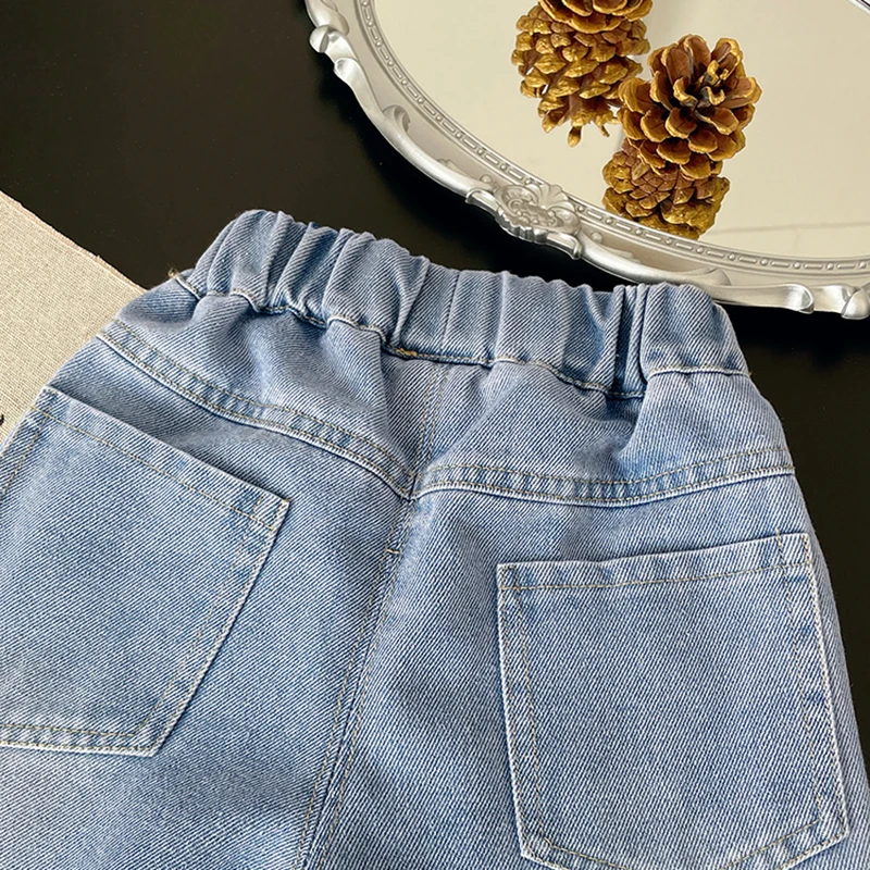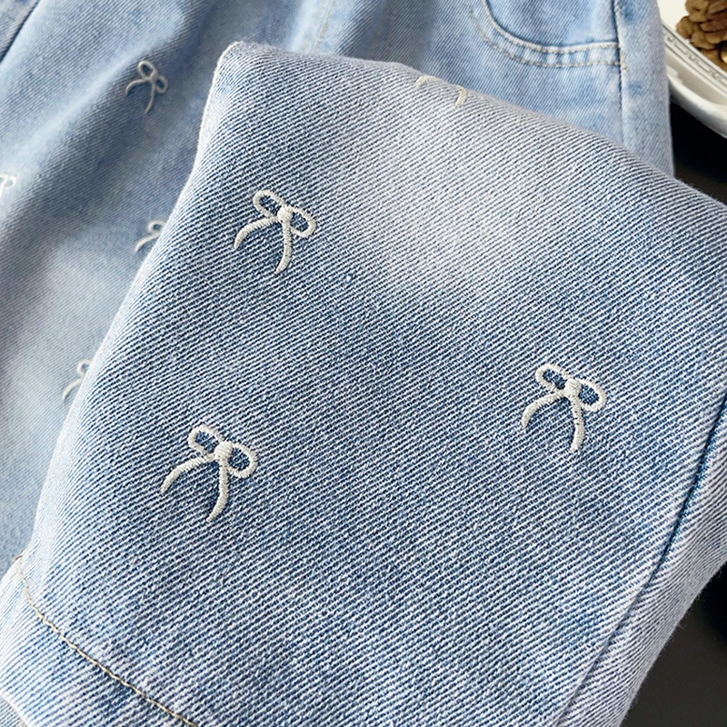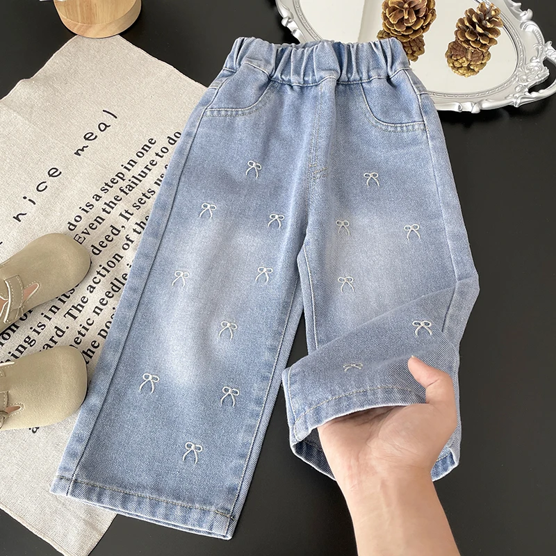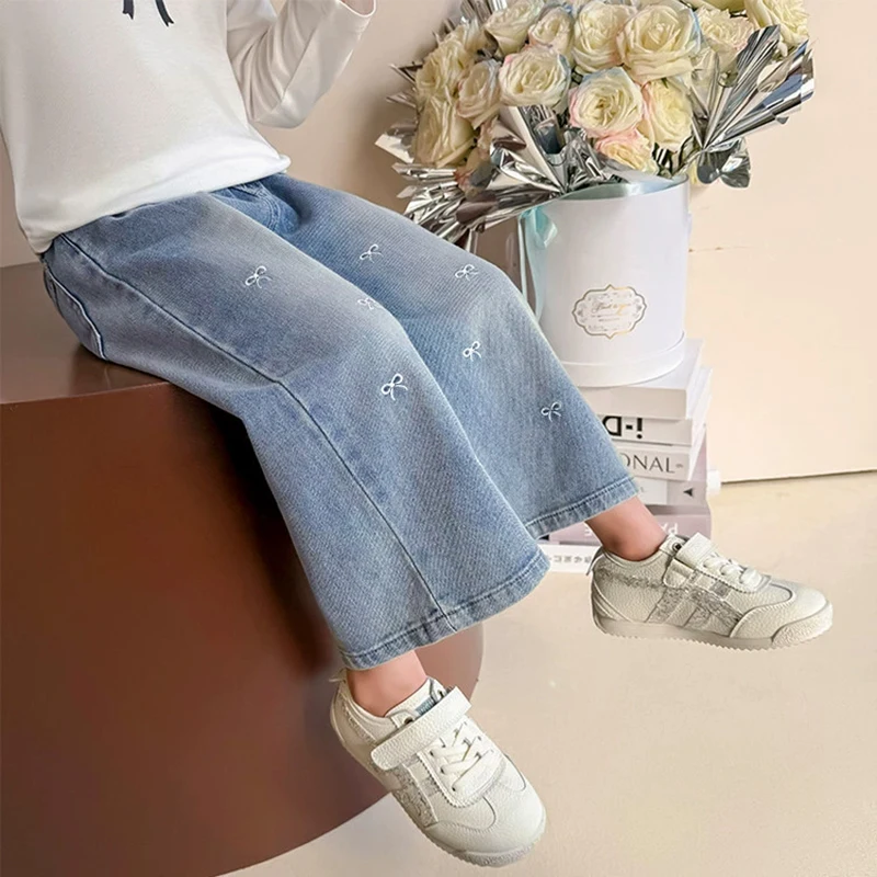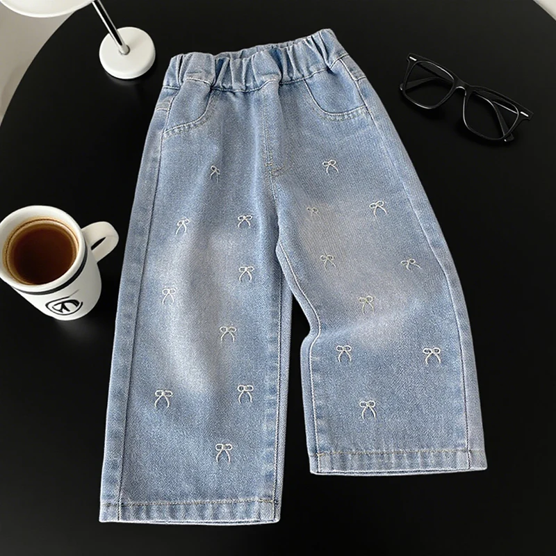 بنطلون جينز جديد للبنات 2026 مزين بعقدة وتطريز، مناسب لفصلي الربيع والخريف، تصميم كاجوال عصري بأرجل واسعة، بنطلون أنيق متعدد الاستخدامات للأطفال.