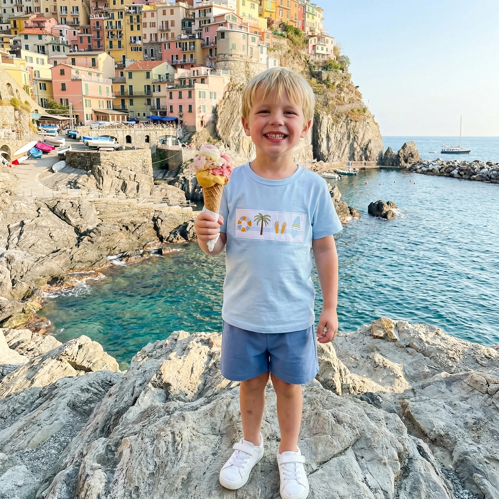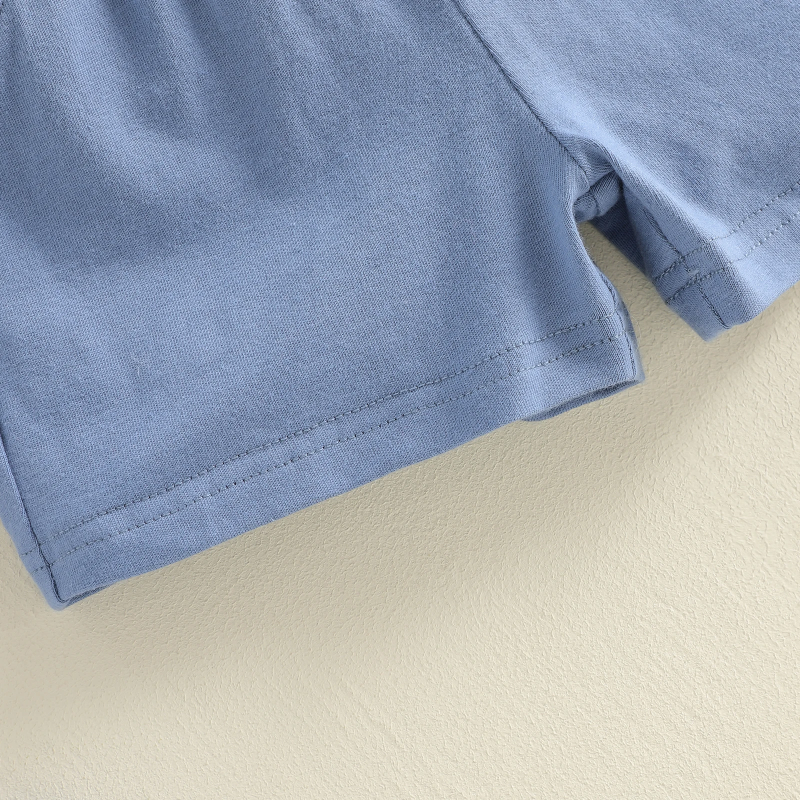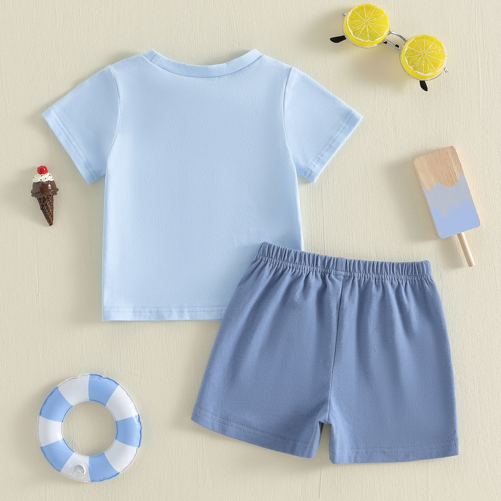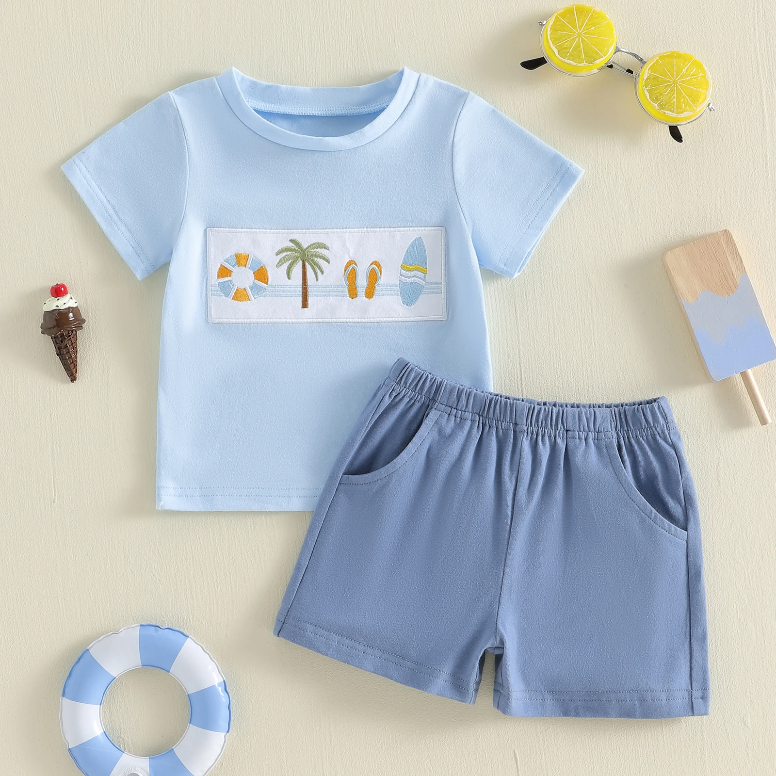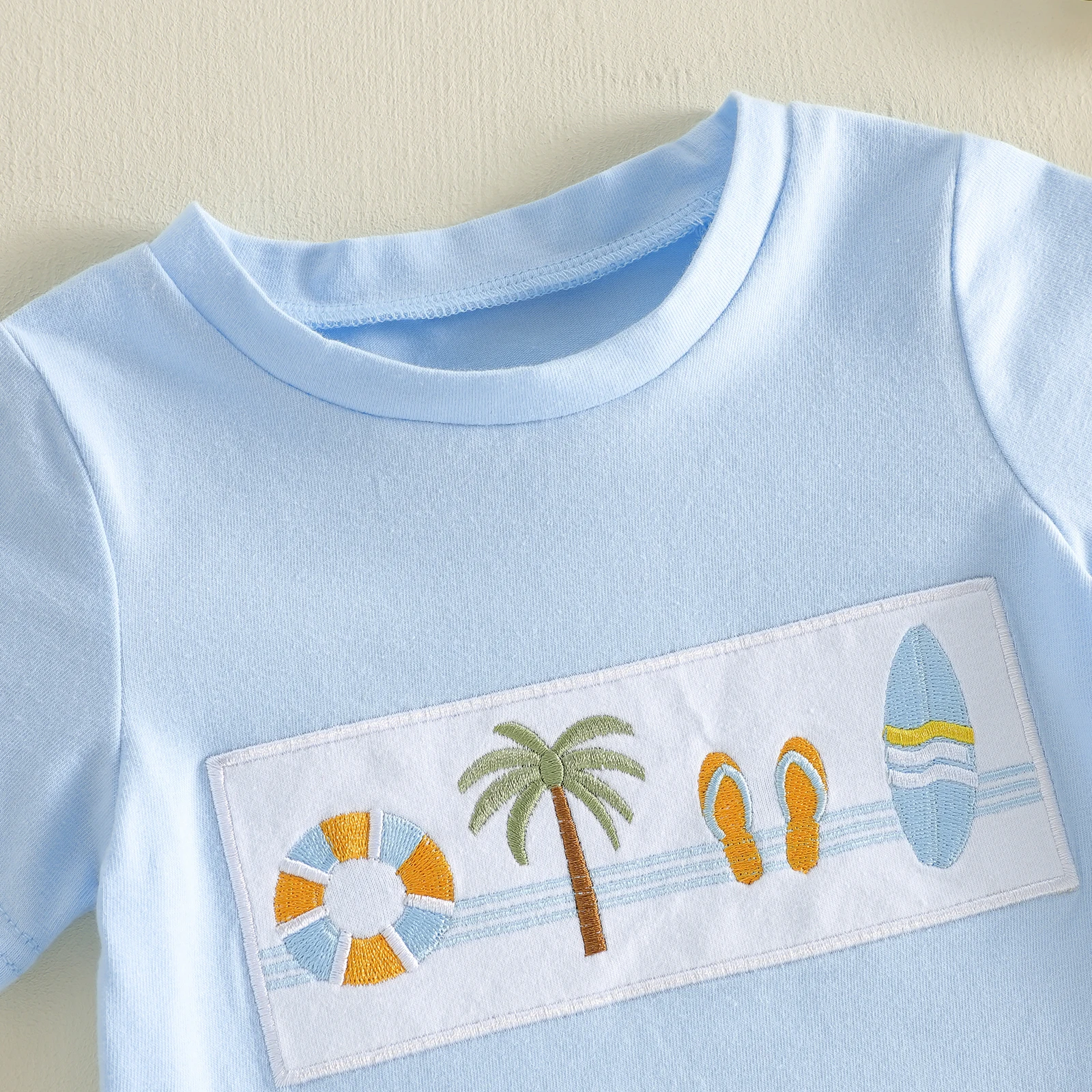 طقم صيفي للأولاد الصغار: قميص بأكمام قصيرة مزين بتطريز شجرة جوز الهند مع شورت – طقم مكون من قطعتين