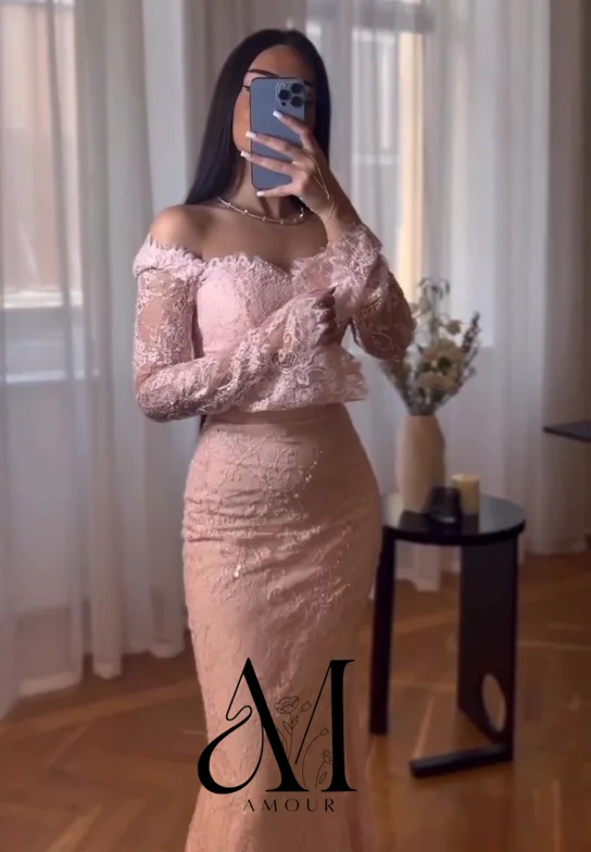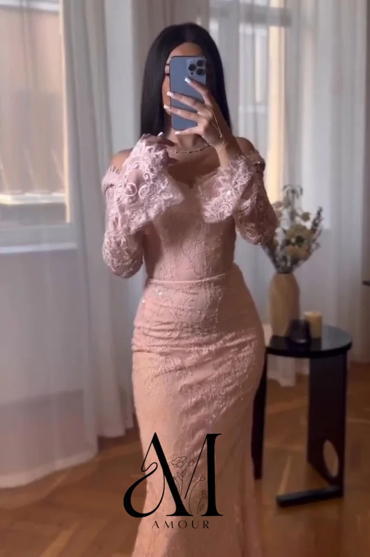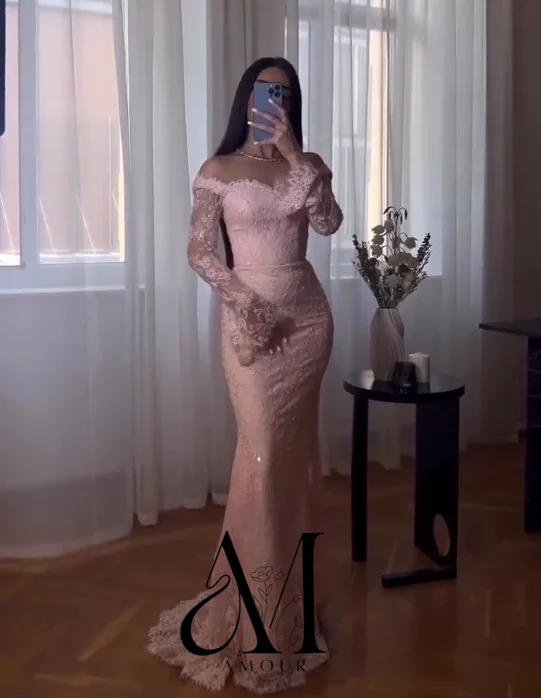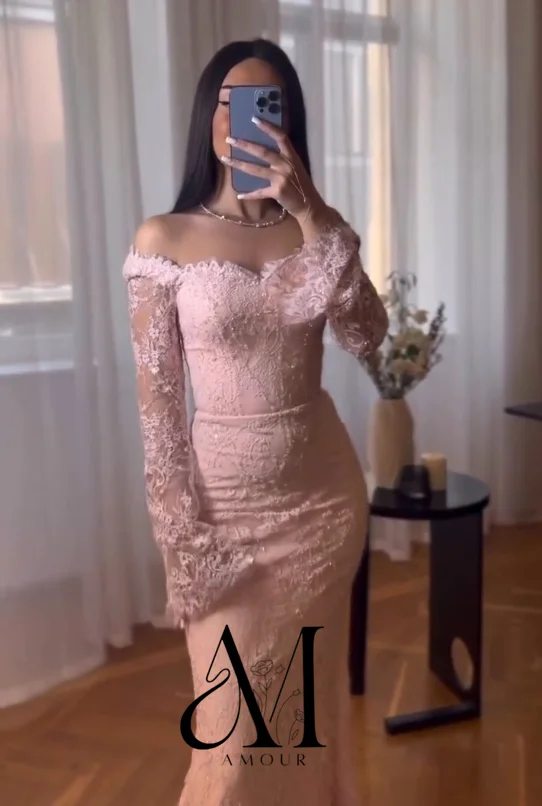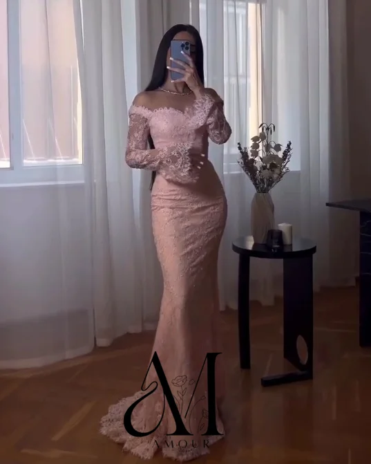 فساتين سهرة سعودية مخصصة على شكل حورية البحر من أمور، بتصميم مكشوف الأكتاف وطول يصل إلى الأرض، مزينة بالدانتيل والترتر وأكمام طويلة، فساتين حفلات أنيقة 2026