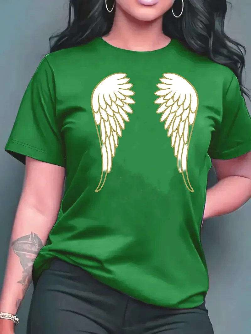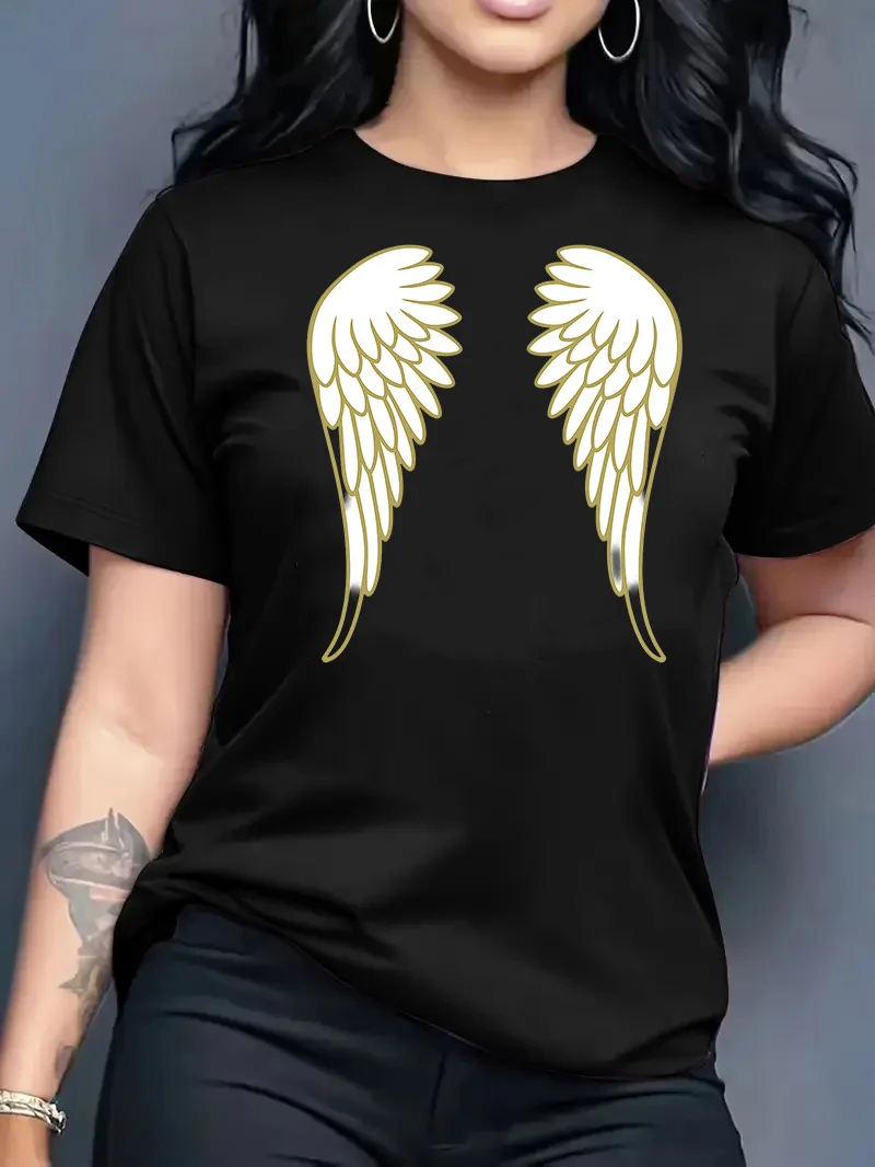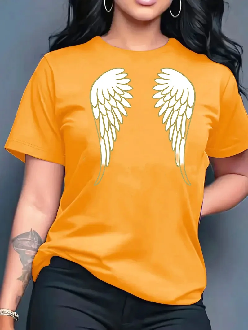 قميص نسائي جديد لصيف 2026 بياقة مستديرة وتصميم عصري فضفاض مع طباعة أجنحة، قميص بأكمام قصيرة للنساء