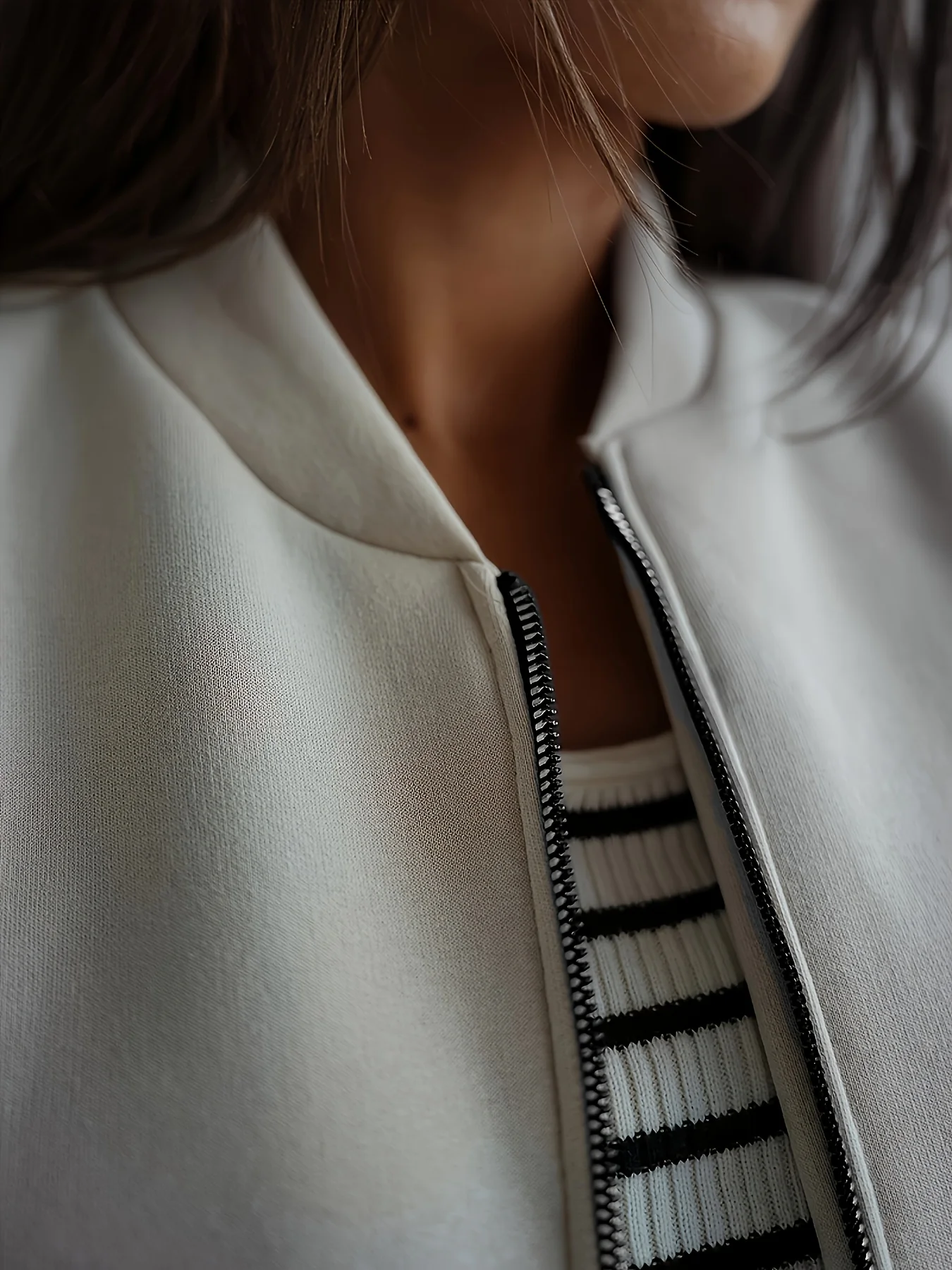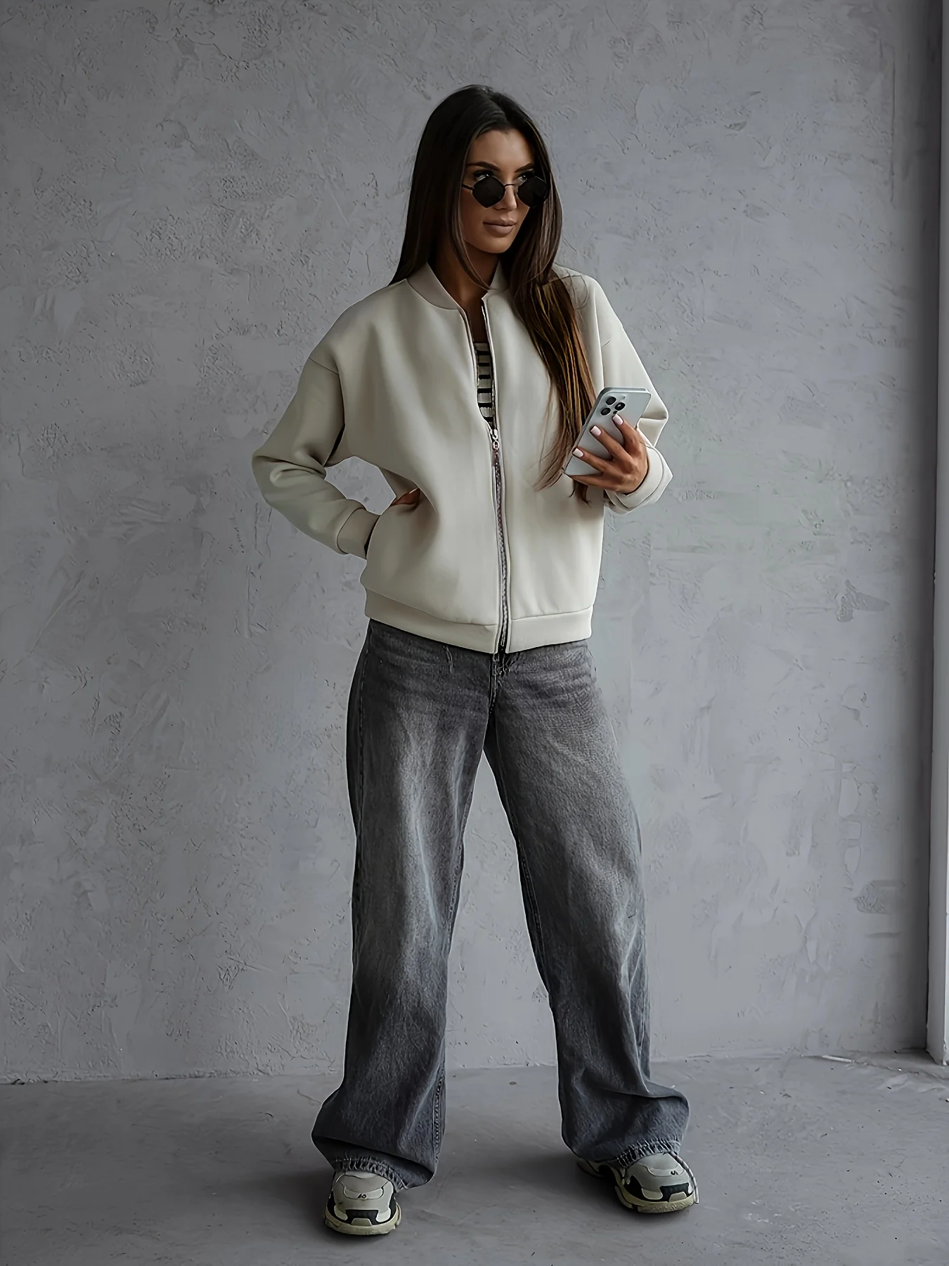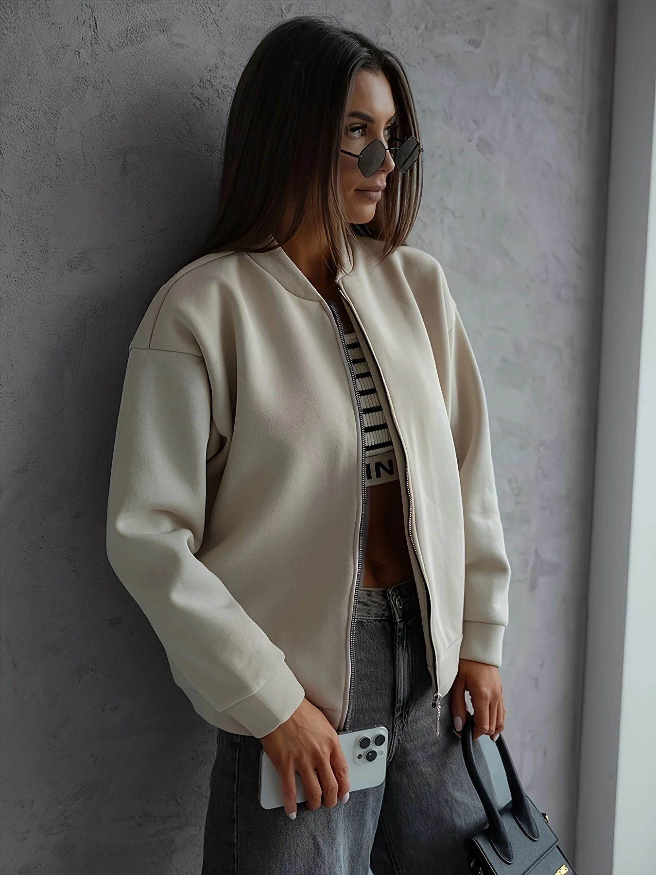 يتميز تصميم هذا الجاكيت البومبر بقصة واسعة توفر الراحة وحرية الحركة، مما يجعله مثاليًا للخروجات الكاجوال.